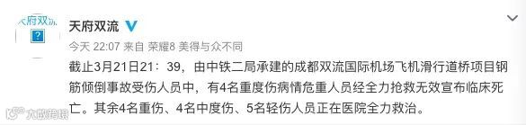 另据中共成都市双流区委宣传部官方微博,截止3月21日21:39,由中铁二局承建的成都双流国际机场飞机滑行道桥项目钢筋倾倒事故受伤人员中,有4名重度伤病情危重人员经全力抢救无效宣布临床死亡。其余4名重伤、4名中度伤、5名轻伤人员正在医院全力救治。