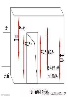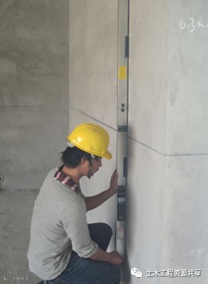 当墙长度小于3米时,同一面墙距两端头竖向阴阳角约30cm位置,分别按以下原则实测2次:一是靠尺顶端接触到上部砼顶板位置时测1次垂直度,二是靠尺底端接触到下部地面位置时测1次垂直度;