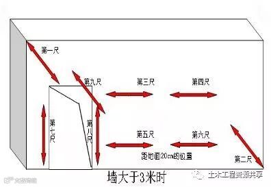当墙面长度大于3米,在同一墙面4个角任选两个方向各测量1次,在墙长度方向任意位置增加2次水平测量,在距离地面20cm左右的位置水平测2次;