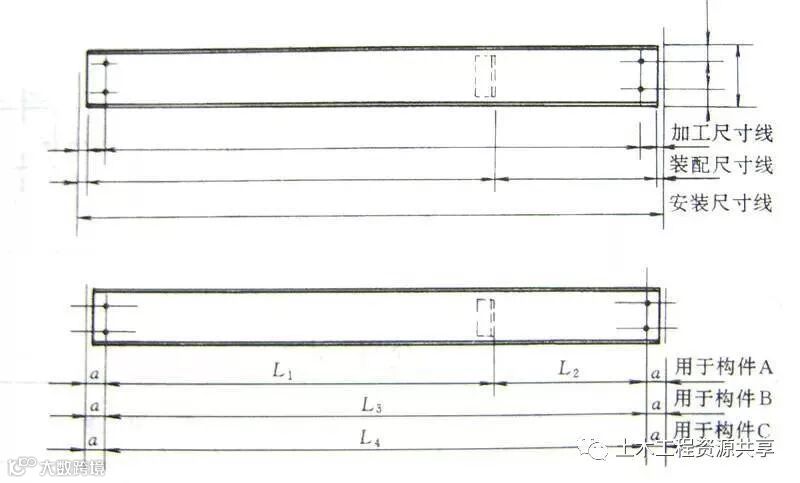 详图的尺寸由尺寸线、尺寸界线、尺寸起止点组成;尺寸单位除标高以m为单位外,其余尺寸均以mm为单位,且尺寸标注时不再书写单位。一个构件的尺寸线一般为三道,由内向外依次为:加工尺寸线、装配尺寸线、安装尺寸线。当构件图形相同,仅零件布置或构件长度不同时,可以一个构件图形及多道尺寸线表示A、B、C!……等多个构件,但最多不超过5个。