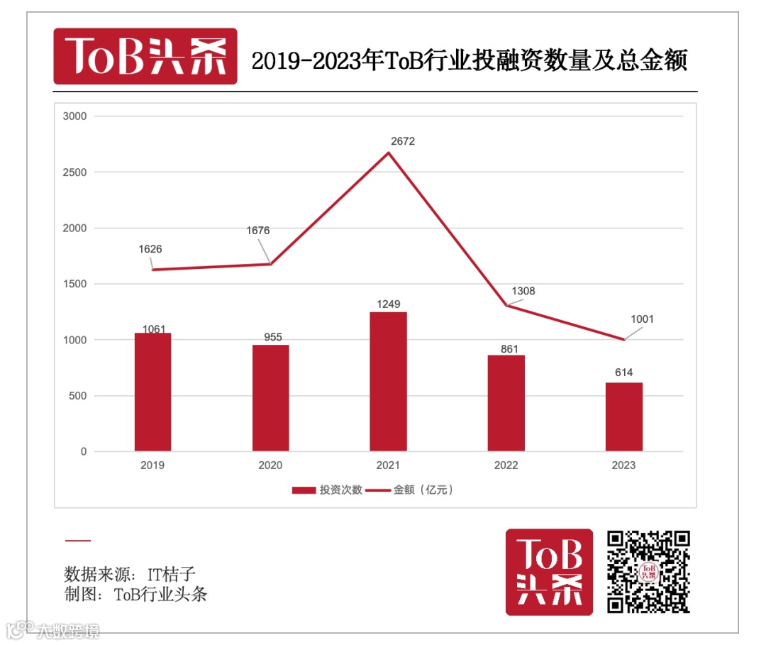 从投融资事件分布来看:2019 年全年,ToB 一共发生 1061 起投融资事件,融资金额累计约 1626 亿人民币。2020 年全年,ToB 一共发生 955 起投融资事件,融资金额累计约 1676 亿人民币。2021 年全年,ToB 一共发生 1249 起投融资事件,融资金额累计约 2672 亿人民币。2022 年全年,ToB 一共发生 861 起投融资事件,融资金额累计约 1308 亿人民币。2023 年全年,ToB 一共发生 614 起投融资事件,融资金额累计约 1001 亿人民币。