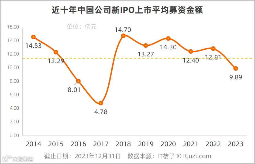 可以看到,自 2018 年以来,新股 IPO 平均募资额正在处于逐渐下跌的趋势,目前数据低于近十年平均值的参考线,仅有 2016 年、2017 年和 2023 年这三年符合。