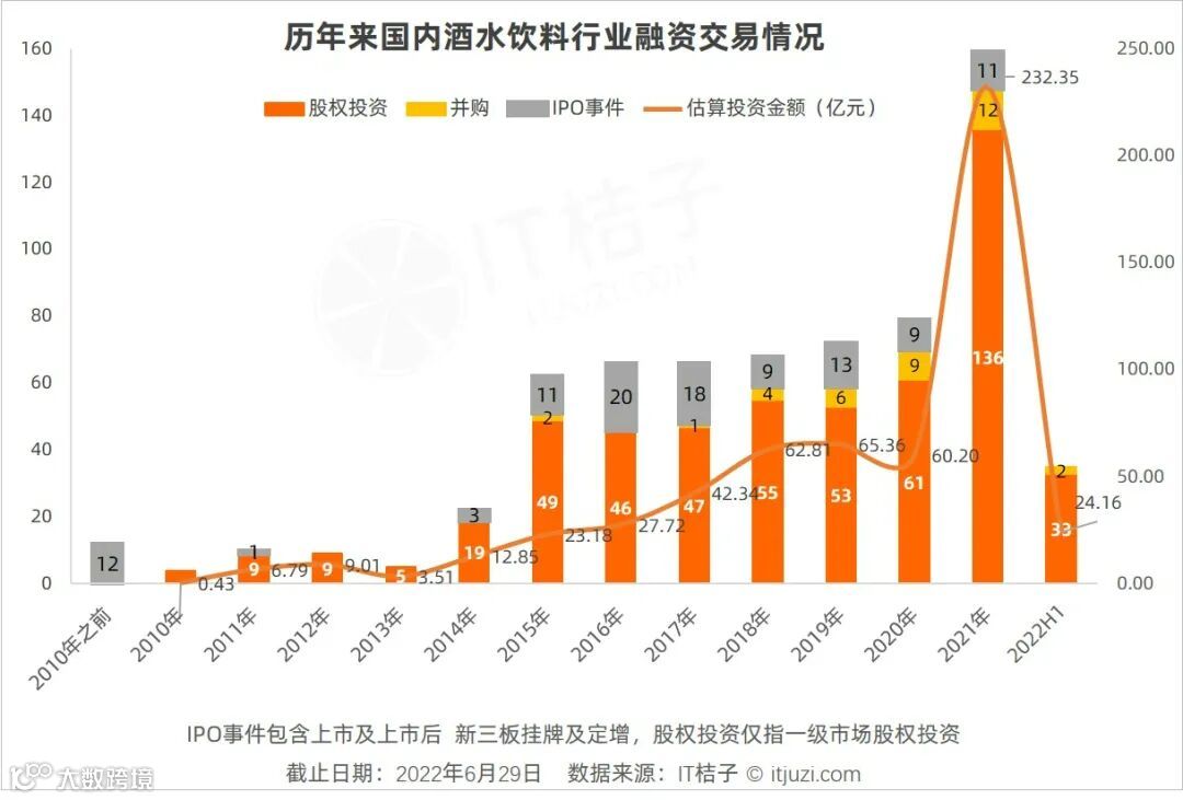 1.2021 年是国内酒水饮料消费投融资最火爆的时期,2022 上半年投资行情可谓「腰斩」。