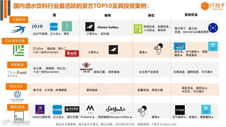国内酒水饮料投资比较活跃的天使和 VC 资方有两类,一类是像红杉中国、真格基金这类大型综合投资机构;另一类则是专注于消费赛道投资的机构,比如天图投资、黑蚁资本、挑战者创投、险峰长青、尚承投资、壹叁资本、宽窄创投。