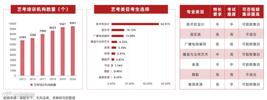由于艺考具有专业特殊性,其主要培训方式以线下集训为主,培训机构分散度高,增长速度快,观研数据显示,2019 年,我国艺考培训机构数量超 9,000 家,行业整体较混乱,高客单价、透明度低、管理差等问题普遍。