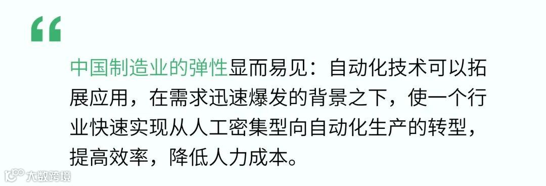 中国制造业的弹性显而易见:自动化技术可以拓展应用,在需求迅速爆发的背景之下,使一个行业快速实现从人工密集型向自动化生产的转型,提高效率,降低人力成本。