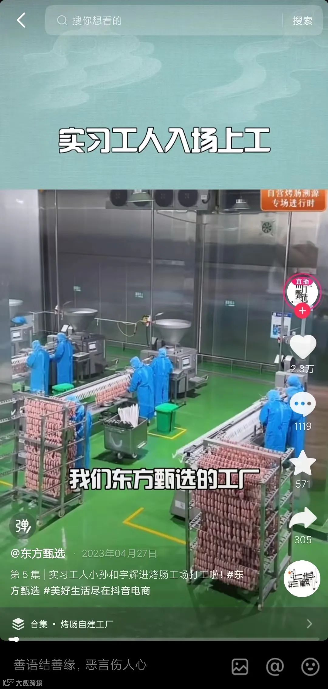 财报显示,2023财年东方甄选自营产品数量已超过264个,带来总营收约19亿元,成为东方甄选的主营业务之一。2024年一月,东方甄选还宣布投入1752万元,专项用于自营烤肠工厂的扩建工程,并在此后实时拍摄工厂内部生产。