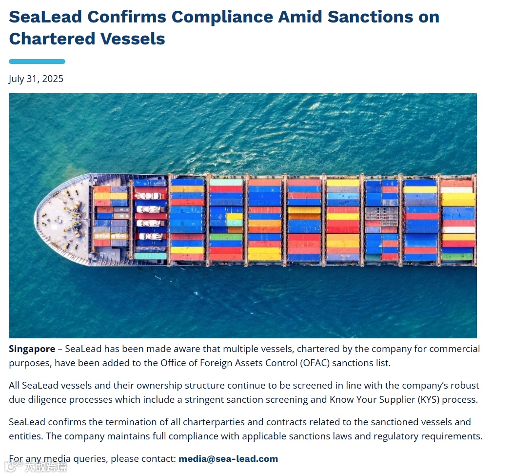 海领船务确认,已终止与所有受制裁船舶及相关实体的租船合同,并表示公司完全遵守适用的制裁法律和监管要求。