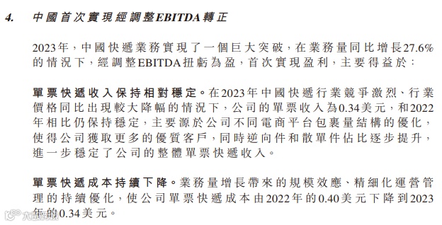以极兔为例,其2023年发生了一个重要转折:在国内经调整EBITDA首次转正,扭亏为盈。据极兔在财报中披露,这背后主要是因为其单票收入较为稳定,仍保持在0.34美元;而其单票成本持续下降,从2022年的0.4美元降至0.34美元,收入已经可以覆盖成本。