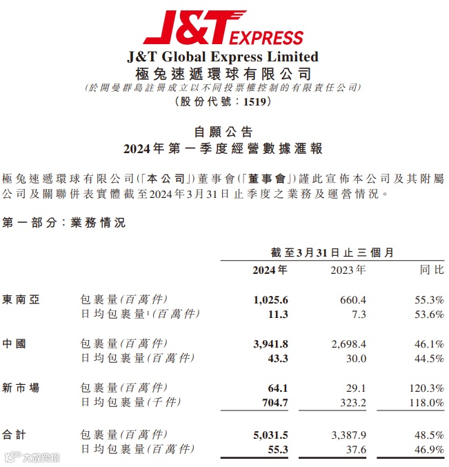 当然,需要注意的是极兔的快递业务量还包括其在东南亚等海外市场的部分。比如其今年第一季度在东南亚就有着10.26亿件包裹,在国内则有着39.42亿件左右。