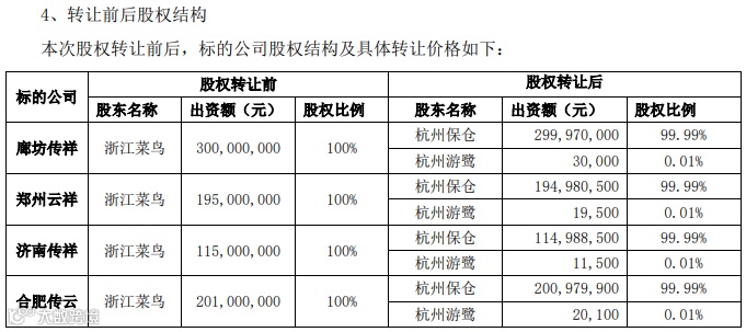 从股权结构来看,这基本等于是菜鸟将四个项目转让给了申通,明面上菜鸟掌控的股权只有很小的一部分。