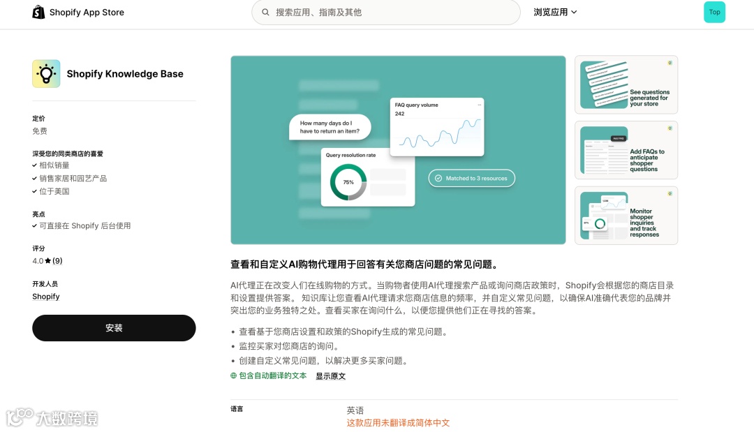 Shopify后台 → Apps → 搜索Knowledge Base → 安装。