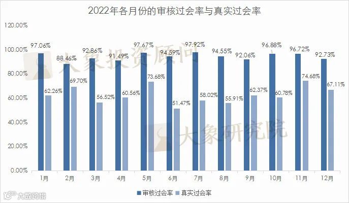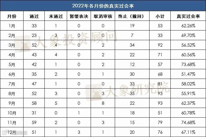 真实过会率方面,11月最高,为74.68%(59家通过,18家取消或撤回);6月最低,仅51.47%(35家通过,31家取消或撤回)。