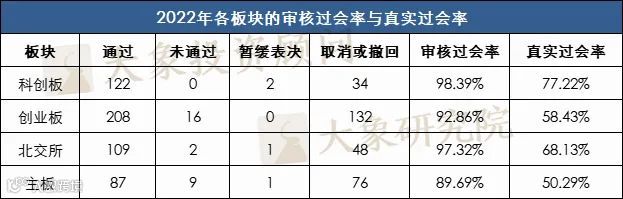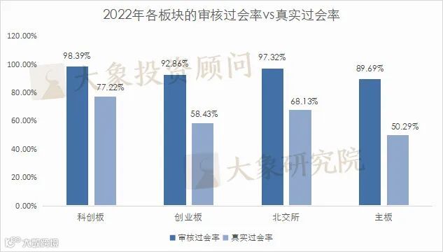 2022年各板块平均审核过会率为94.56%,平均真实过会率为63.51%,其中主板与真实过会率差距最大,达39.40个百分点。