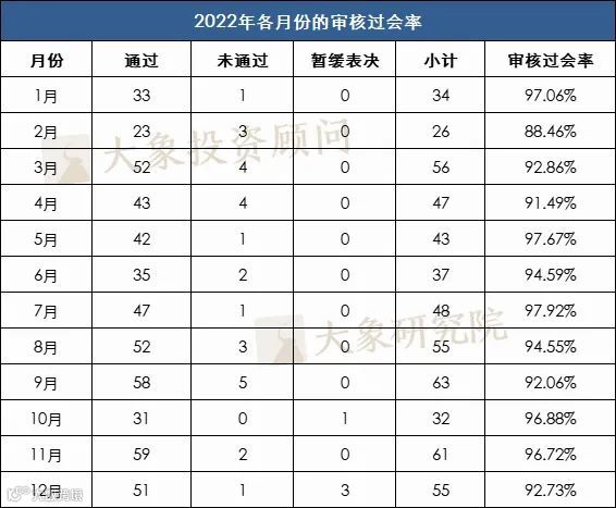 2022年7月审核过会率最高,达97.92%(48家上会,47家通过);2月最低,为88.46%(26家上会,23家通过)。