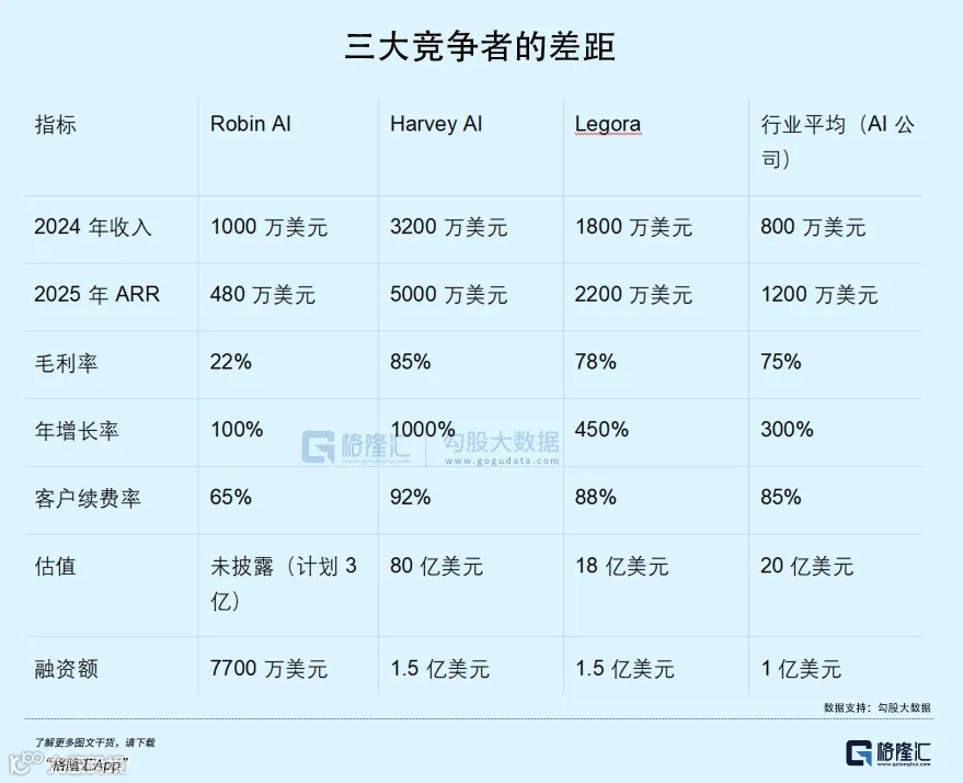2025年Q1–Q2,Robin AI仅签约2家新客户,Harvey签约17家,Legora签约11家;其年均服务费80万美元,而Harvey仅50万美元且体验更优。