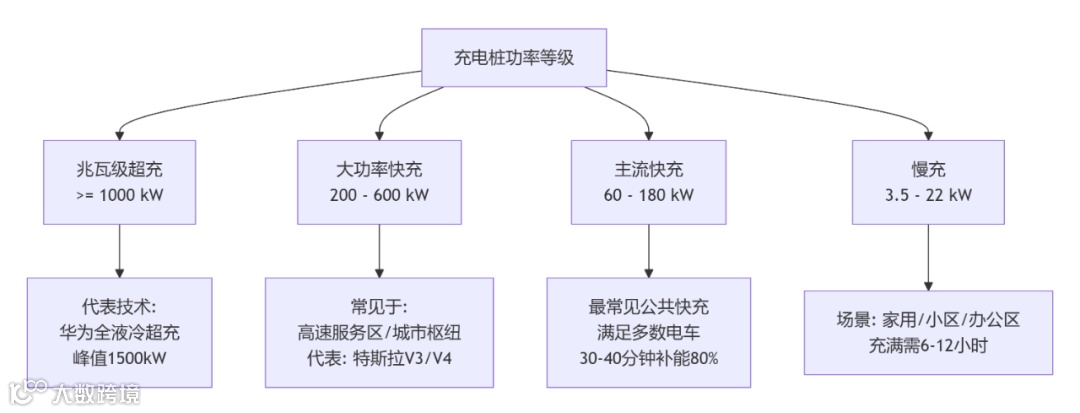 目前,充电桩单枪的最大功率在技术上已经能够做到1500千瓦(1.5兆瓦) 甚至更高,这代表了当前的行业顶尖水平。为了让你更清晰地了解功率等级的划分,可以参考下图: