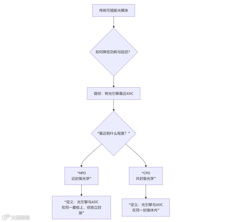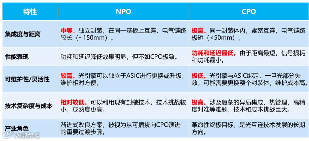 从上面核心定义来看,NPO跟CPO还有点像,只是CPO强调共封装,CPO将光引擎和交换芯片(ASIC) 直接集成在同一个封装壳体内。它们共享同一个封装基板,电气互连距离被缩短到极致。