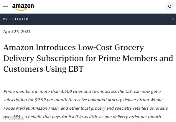 4月23日,亚马逊宣布正式推出新的杂货递送订阅服务,旨在满足其Prime会员和符合政府食品援助福利资格的客户的需求。