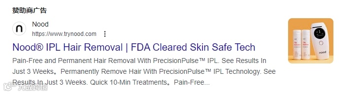 搜索广告:Trynood的广告文案,基本上都是围绕着其卖点展开的,即减轻痛苦、永久脱毛、快速见效。为提升消费者信任度,Trynood还特意强调其经过了FDA权威认证,这是能够有效增强消费者购买信心的。