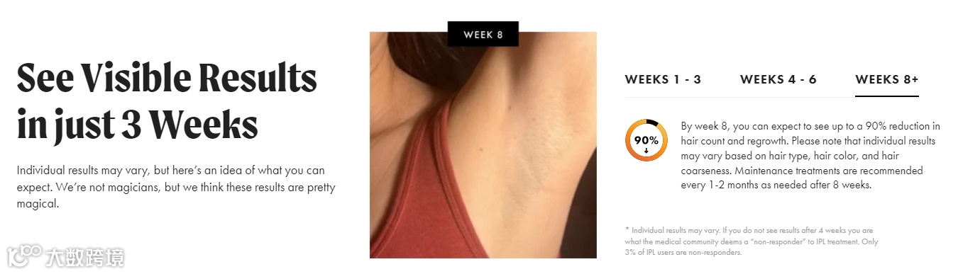 Trynood的产品在家即可使用,且在三周内就能见效,Trynood表示到第八周,90%的毛发就会被清除掉。这个速度实际上是非常快的,因此其是能够吸引那些追求快速出结果的消费者的。