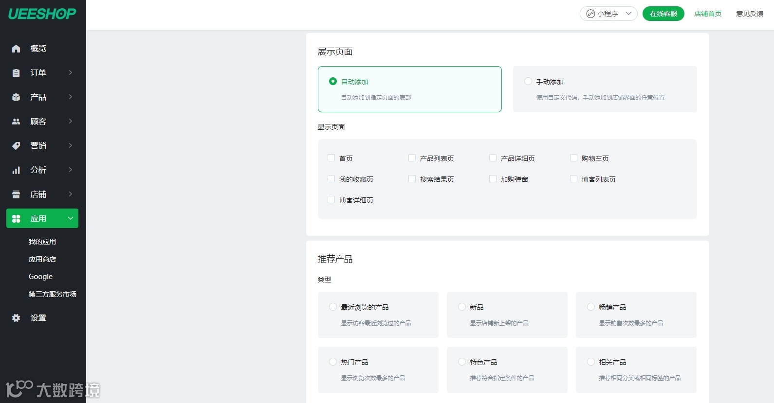 Ueeshop推荐产品功能,可推荐不同的产品到店铺的指定页面,这是能够有效提升产品曝光度,同时吸引顾客购买更多产品,进而提升网站销量的。