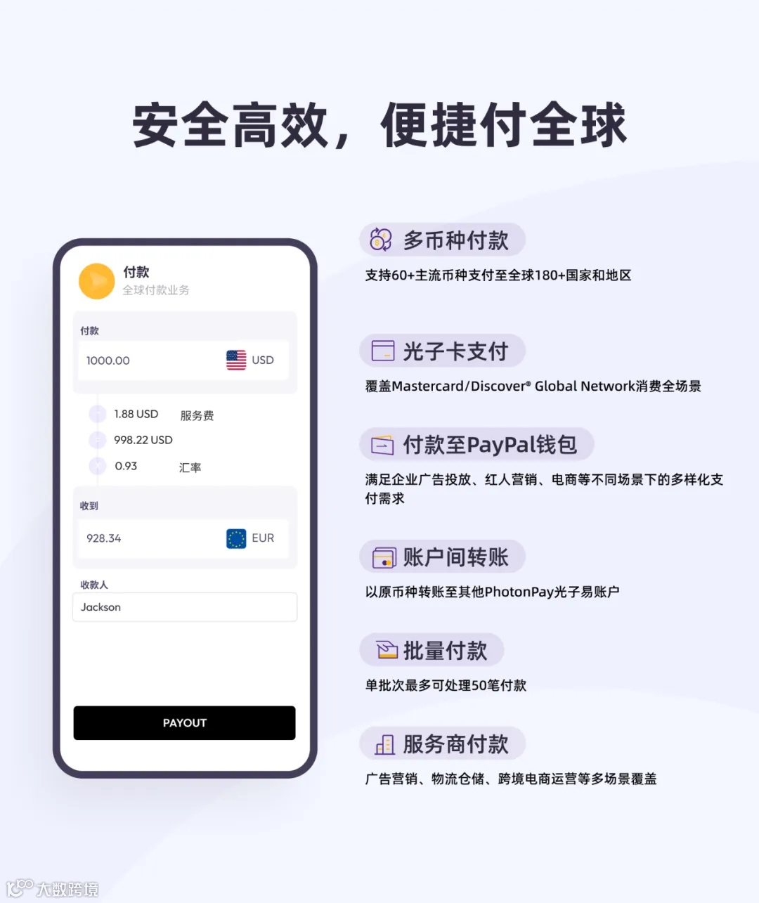 PhotonPay光子易用户可通过商户端,使用USD、EUR、HKD等币种直接向67个国家和地区的企业或个人的PayPal钱包直接付款,满足企业完成广告投放、红人营销、电商等不同场景下的多样化支付需求。
