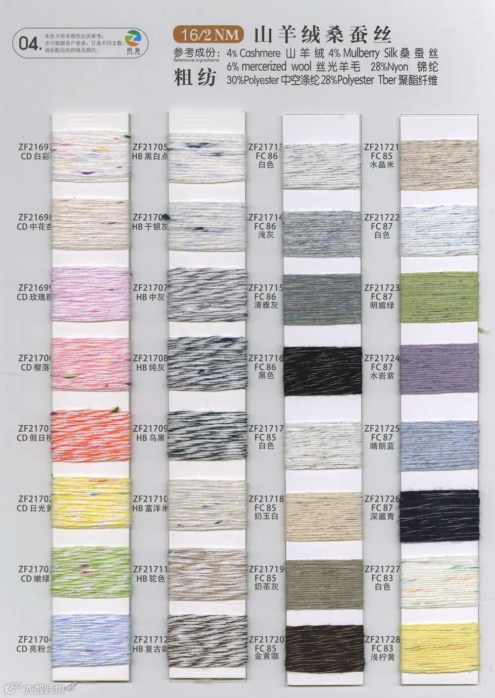 产品名称:山羊绒桑蚕丝。采用优质原材料精制而成,规格为16/2NM。含有珍贵山羊绒和桑蚕丝成分,兼具柔软与光泽。融入丝光羊毛,增强质感与保暖性。搭配锦纶和中空涤纶,提高弹性和透气性。聚酯纤维的运用,赋予其更强的耐用性和稳定性。