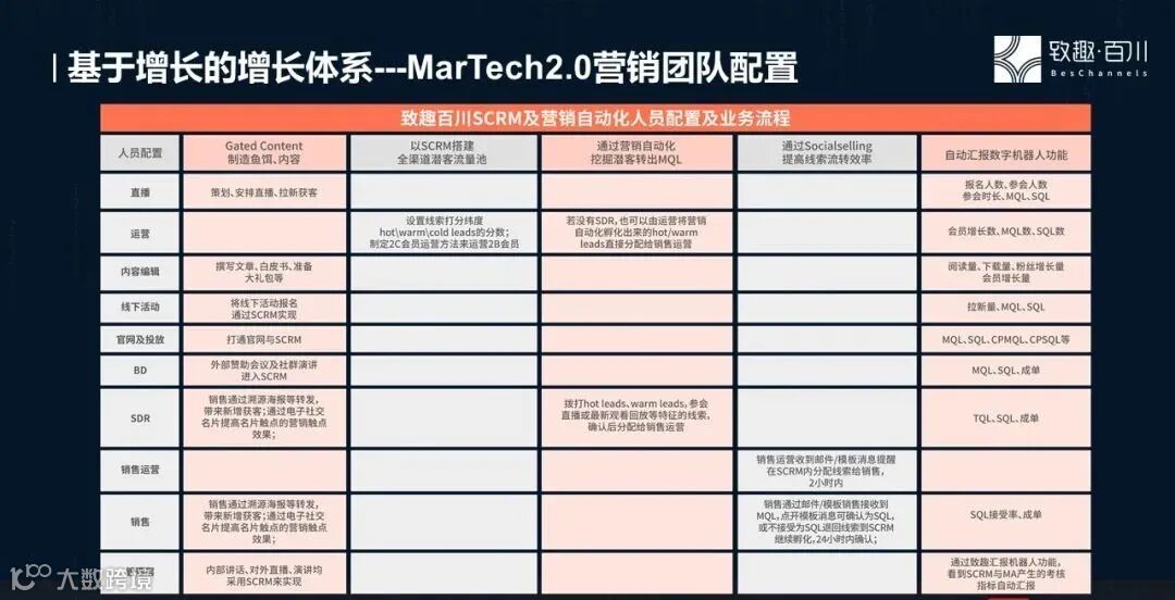 致趣百川创建了基于增长的增长体系的MarTech2.0营销团队配置,从直播、内容到线下活动到BDR、SDR,再到销售;通过直播、白皮书、线下活动等内容吸引用户关注,以SCRM搭建全渠道潜客流量池,接着通过营销自动化挖掘潜客转出MQL,最后通过SocialSelling提高线索流转效率。