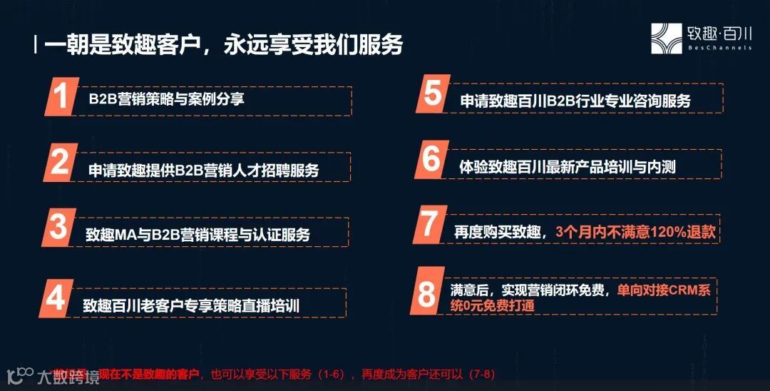 此外,致趣百川还提出了“一朝是致趣客户,永远享受我们服务”的概念。图片中1~6是我们对老顾客永远的服务。对于那些曾经使用过致趣百川,但后来因为我们自己不够好而离开我们的人,1~6的服务,还永远对他们敞开怀抱。