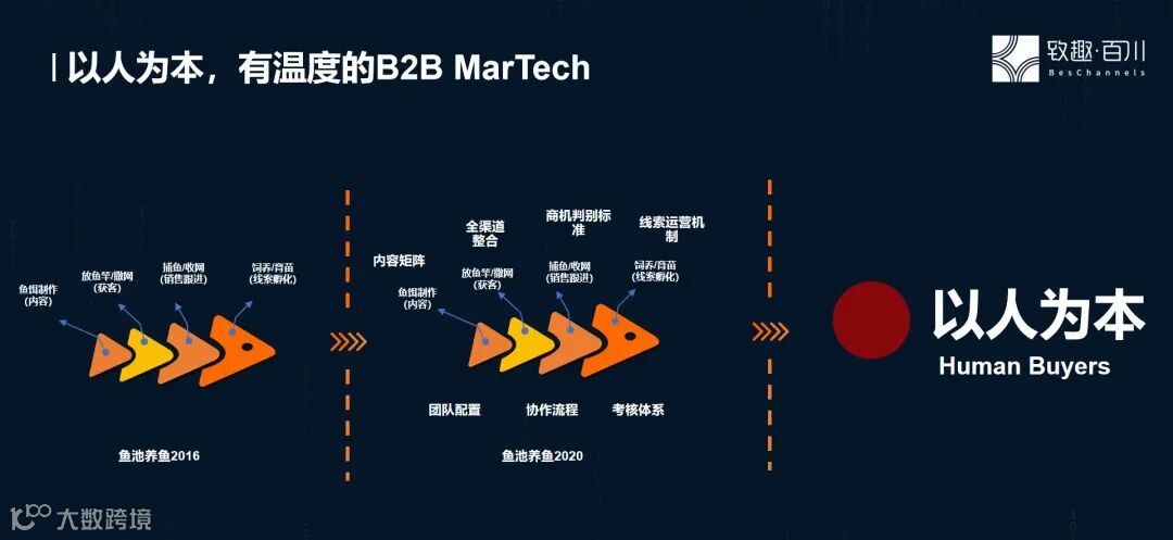 熟悉致趣百川的老朋友都知道,早期我们会比较多地去对标一些国外公司,还分享了自己的方法论:鱼池养鱼论,简单来说就是把在座的客户当成“鱼”,用好的内容去吸引客户,比如通过活动、官网、电子邮件等等触达用户。