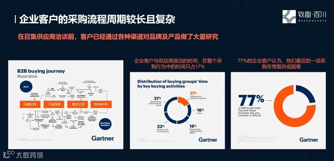就以B2B 行业而言,企业客户的采购特征非常独特——企业客户的采购流程周期较长且复杂,而且在召集供应商洽谈前,客户已经通过各种渠道对品牌及产品做了大量研究。根据调查研究,77%的企业客户认为,他们最近的一项采购非常复杂或困难;企业客户与供应商接洽的时间,在整个采购行为中的时间只占17%。