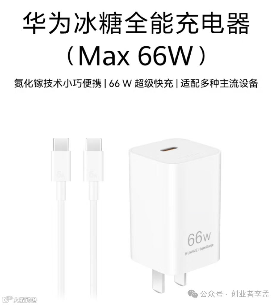 推荐:华为的冰糖全能充电器(Max 66W),采用了氮化镓技术,小巧便捷,是 66W 超级快充的华为充电器,适用于 Mate70 系列/Pura X 。