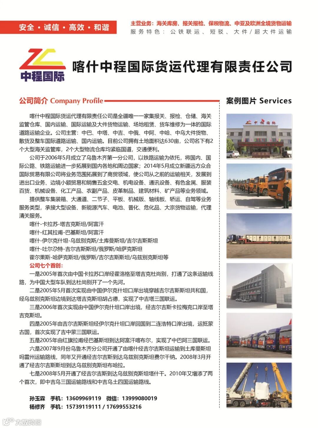 喀什中程国际货运代理有限责任公司是新疆唯一集报关、报检、仓储、海关监管仓库、国内运输、国际道路运输及大件货物运输、场地租赁、货车维修于一体的综合性国际道路运输企业。