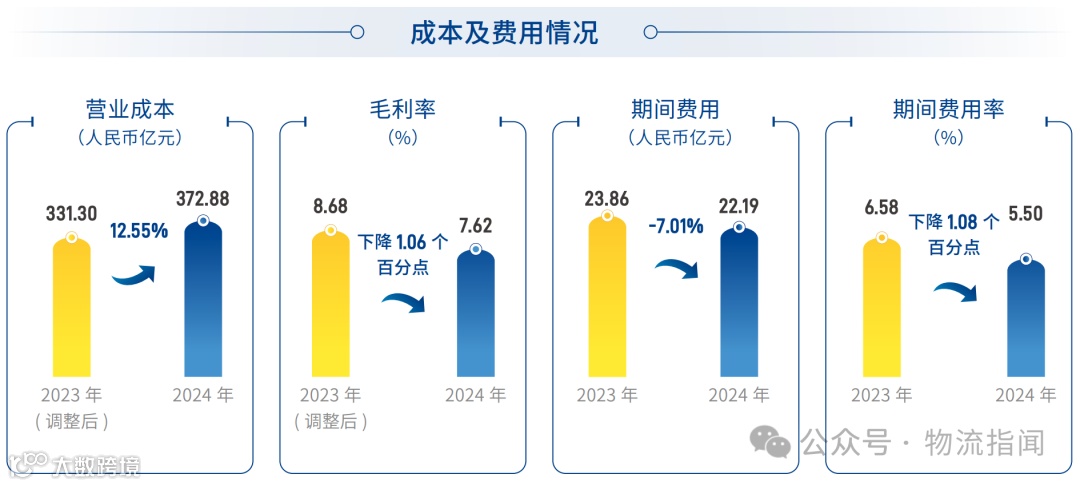 其次,精细化管理释放利润空间。2024年,德邦期间费用为22.19亿元,同比下降7.01%,占收入比下降1.08个百分点。其中管理费用12.41亿元,同比下降20.40%,占收比下降1.22个百分点,优化成效显著。公司已在48个场地投入自动化设备,提升分拣效率与质量。