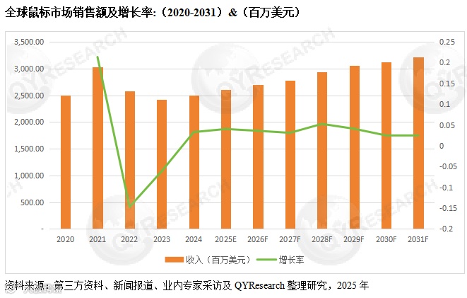 2024年,全球鼠标市场规模达到了25.07亿美元,预计2031年将达到32.10亿美元,年复合增长率(CAGR)为3.52%。
