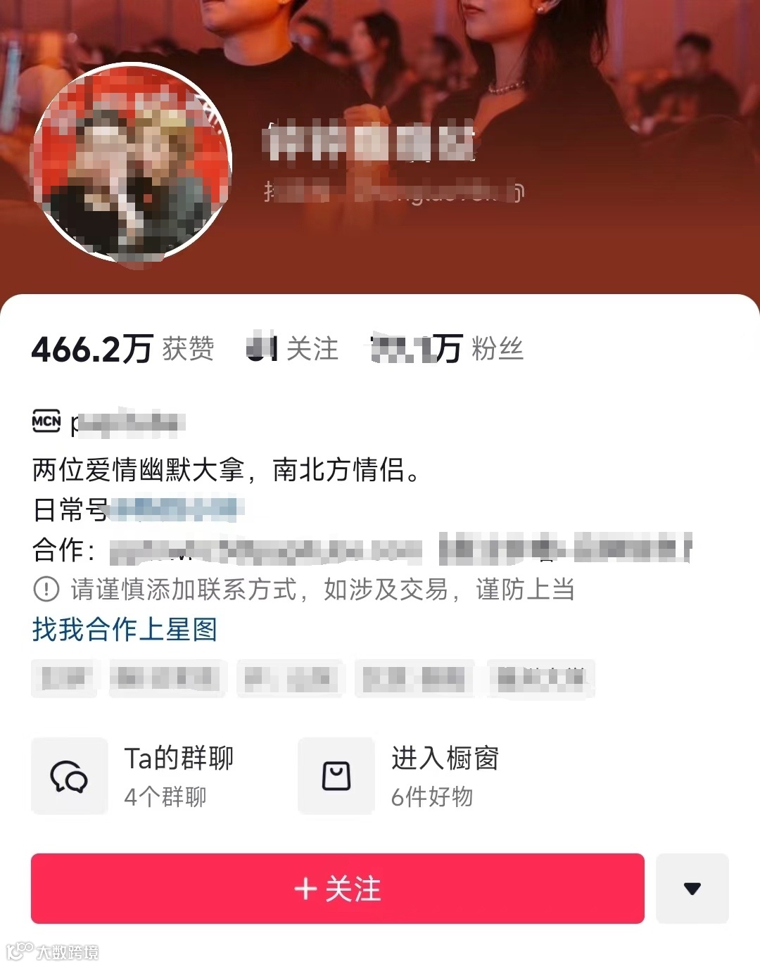 如下图,当我们进入红人的主页时,看到“MCN”符号则表明该红人与MCN机构签约,主页下提供的合作联系方式,大概率也不是网红本人回复,而是其背后的团队或公司在与你对接。