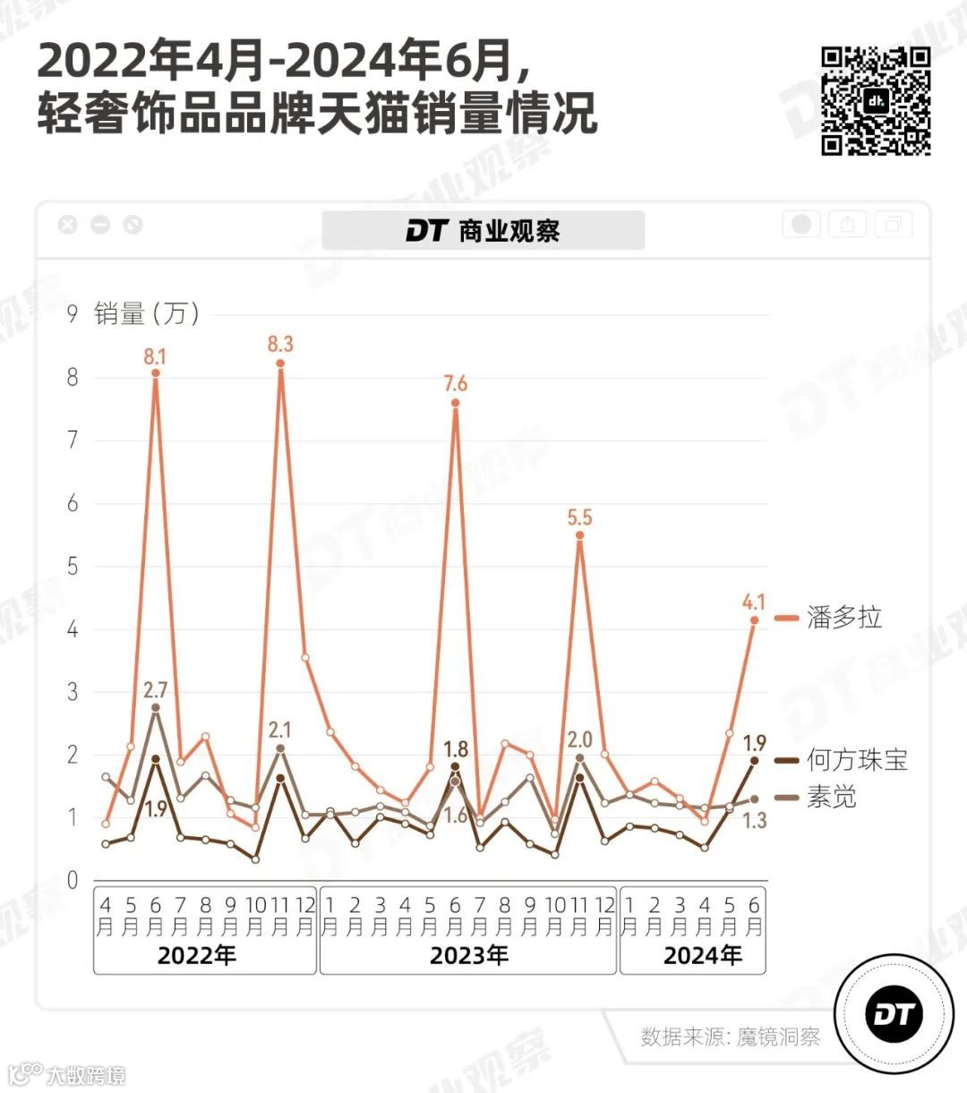 品牌销量呈现明显周期性:每年6月(618)和11月(双11)为销售高峰。2023年,何方珠宝仅靠这两个月大促,便贡献了全年天猫销量的三分之一;潘多拉同期销量也占全年四成以上。