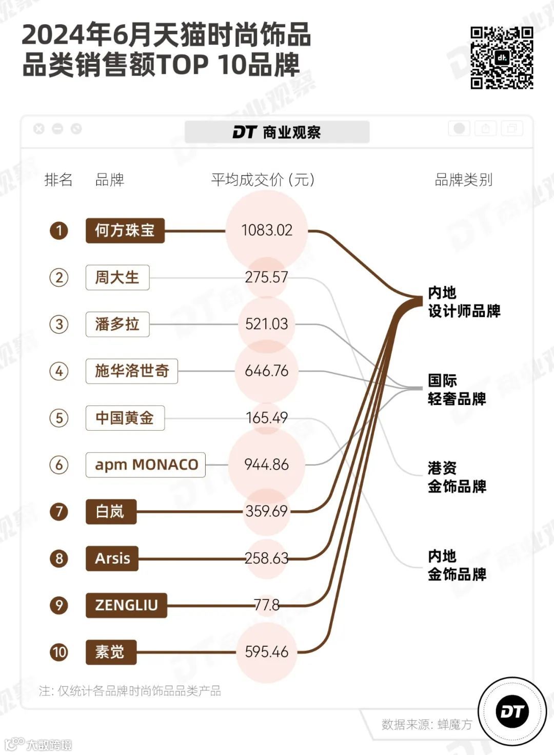 蝉魔方数据显示,2024年6月天猫时尚饰品TOP10品牌中,一半为内地设计师品牌,包括何方珠宝、白岚、Arsis、ZENGLIU和素觉。