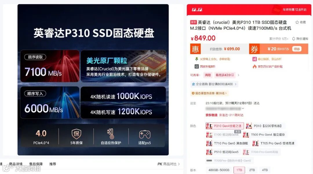比如英睿达的P310 1TB M.2 固态硬盘,一款经典的 NVMe PCI-E 4.0 产品,今年 9 月的价格为 469 元,而现在已经飞涨到了 849 元。
