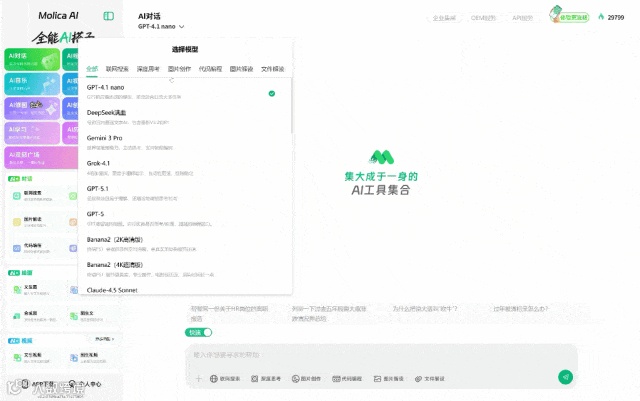 聚合了Gemini3.0、Nano Banana Pro、Sora2、ChatGPT5.1、Claude4.5、Grok4.1、Midjourney绘画、SUNO音乐、DeepSeek3.2......等全球最强AI于一身的「Molica AI」,年终钜惠来袭!