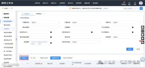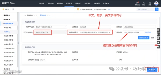在平台店铺商品编码框中输入入仓SKU,查找并维护对应商品,操作前需核对商品名称与实物一致。