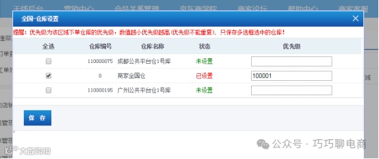 先勾选“商家全国仓”并保存,切勿勾选全国下的京东仓。