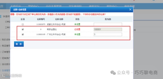 勾选“商家全国仓”和“广州公共平台仓”,将广州仓优先级设为1。