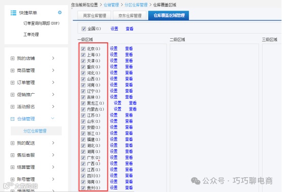随后,针对各一级区域(省份/直辖市)分别设置覆盖仓及优先级。