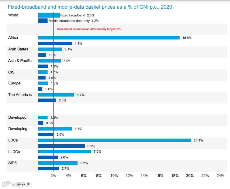 据 ITU《Facts and Figures 2021》数据显示,非洲移动互联网数据成本占GNI(国民总收入)占比是同期世界平均水平的4倍左右,PC端更是高达近7倍。