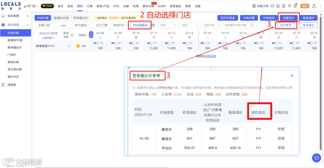2.多平台控价:覆盖 OTA 平台、酒店自有预订渠道及各类分销平台,实现价格统一管控 ,避免不同平台因定价差异产生 “价格冲突”,协同提收益。