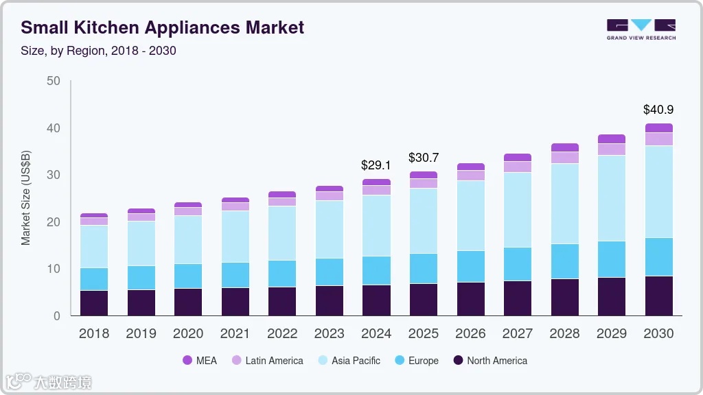2024年全球小型厨房电器市场规模估计为290.9亿美元,预计到2030 年将达到409亿美元,2025年至2030年的复合年增长率为5.9%。