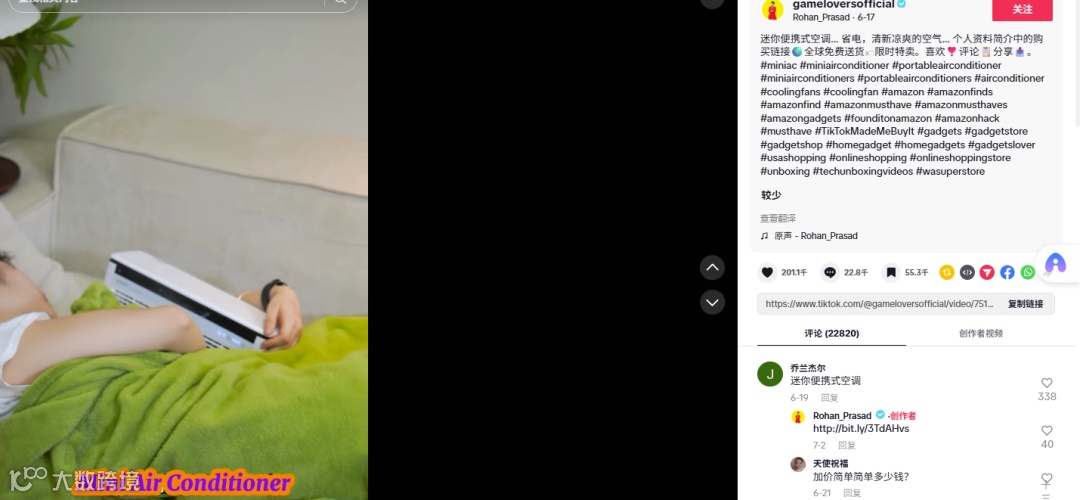 视频中,一位女士将迷你空调放在厨房、卧室、书桌等场景,展示操作方法和使用效果,并且将产品拆解开,细致地解读迷你空调运行原理,测试空调的温度和制冷速度,生动有趣该视频吸引了1200万次观看,获得20.1万次点赞,这款可随手拆卸携带的迷你空调掀起TikTok用户购买狂潮。