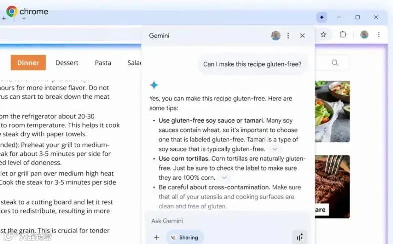 此外,Gemini AI助手将深度集成至Chrome浏览器。用户点击右上角图标即可调出浮动聊天窗口,随时提问当前网页内容。今年晚些时候,Gemini将支持跨标签页提问,并最终实现主动浏览网页、代为操作的功能。